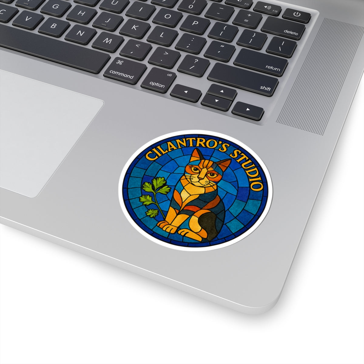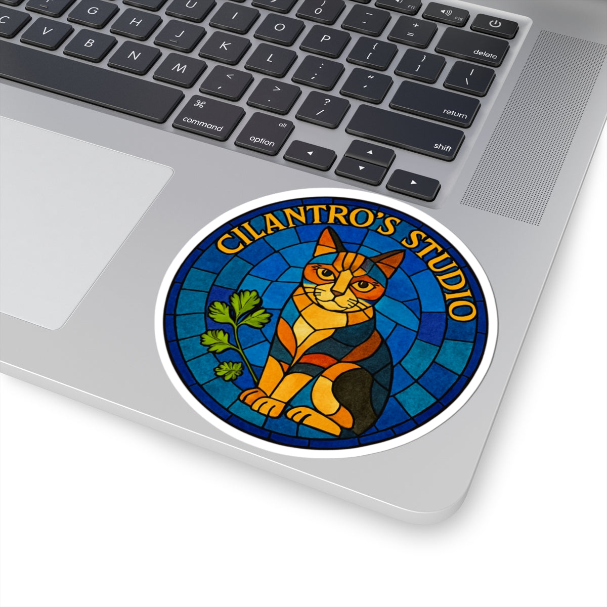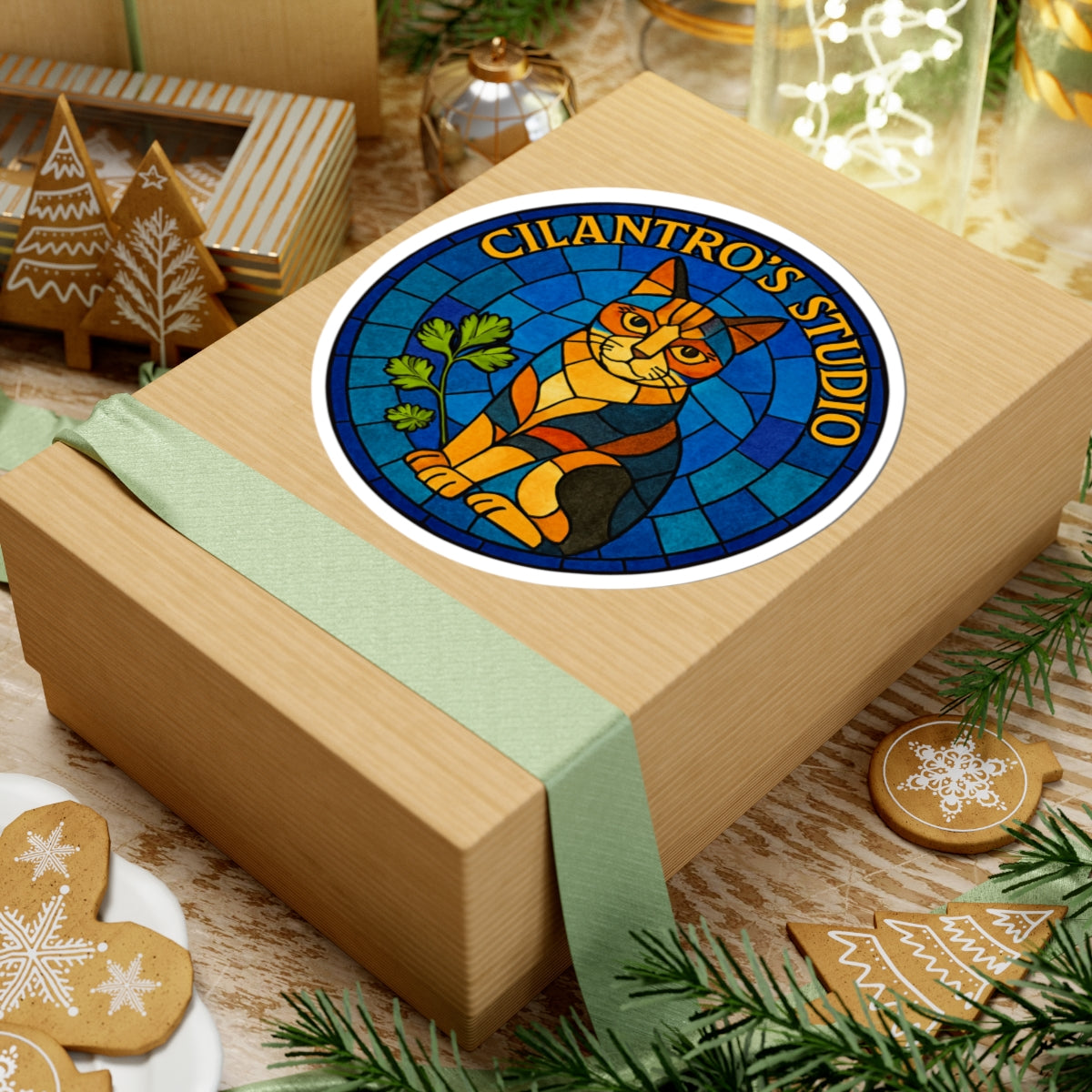Discover the Cillie Mosaic Sticker from Cilantro's Studio~ A stained-glass-inspired cat and cilantro leaf design that blends cosmic whimsy with mystical charm. Ideal for journals, laptops, and creative altars.